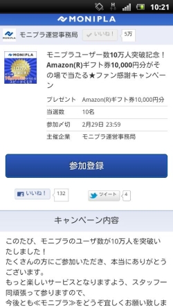 このたびのユーザー数10万人突破を記念して、「モニプラ」アプリのFacebookページでAmazonギフト券(10,000円分)が当たるキャンペーンを2月9日より実施しています。