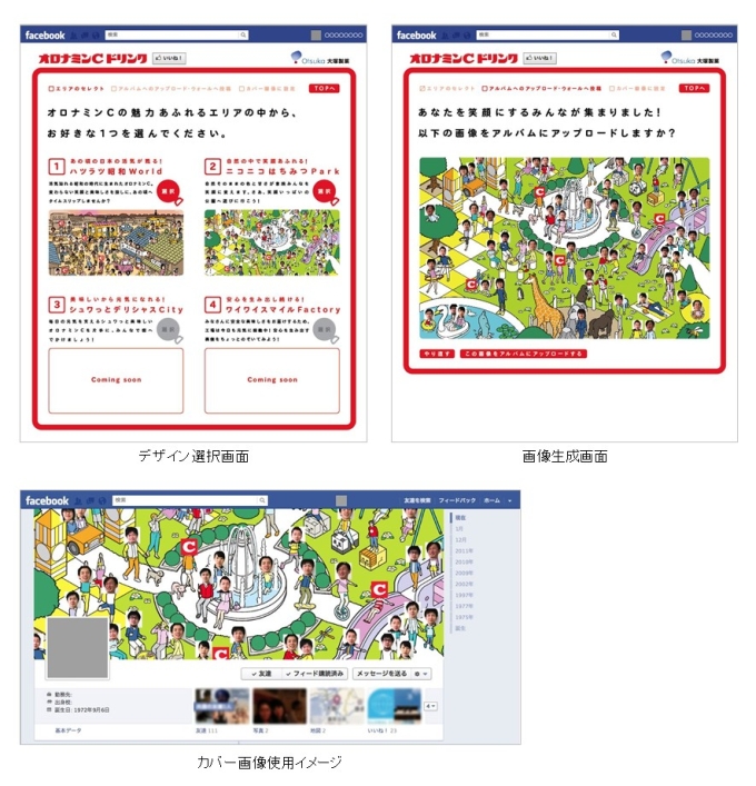 カバー生成の流れ「オロナミンC」のFacebookページにアクセスし、「みんなが Make Me Smile!」アプリをインストールします。その後、「ハツラツ昭和World」「ニコニコはちみつPark」「シュワっとデリシャスCity」「ワイワイスマイルFactory」の4種類のデザインから好みの画像を選択すると、Facebook上で登録している「友人」たちのアイコンが合成されたオリジナルのカバー画像がFacebookの「アルバム」に生成されます。プロフィールページから設定を変更することで、カバー画像として使用することができるようになります。 |