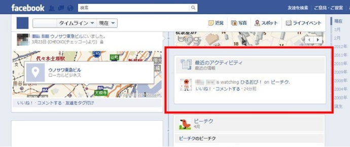 番組を視聴しながらピーチクで「おしゃべり」を投稿すると、自分のタイムライン上のアクティビティに「●●(ユーザー名) is watching ■■(番組名)」と自動的に投稿され、「いま観ている番組」をFacebook上で手軽に共有することができます *1。