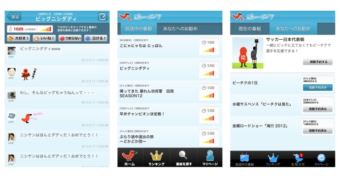 また、オープングラフに対応した「ピーチクスタンプ」機能を新たに追加しました。「いいね!」「わくわく!」「つまらない」「泣ける!」の4種のボタンのいずれかを押すと、ピーチクのタイムライン上にオリジナルの絵文字が投稿され、文字を打ち込まなくても番組の感想を直感的に表現することができます。Facebookのアクティビティには、スタンプまたはつぶやき投稿のいずれかを、一番組につき一回目に動作した際に自動表示されます。