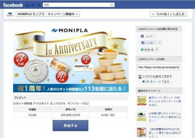 ソーシャルメディアマーケティング事業を手がけるアライドアーキテクツ株式会社(本社:東京都渋谷区、代表取締役社長:中村壮秀、以下アライドアーキテクツ)は、Facebookアプリ「モニプラ」のサービス開始1周年を記念して、5月21日より「モニプラアプリ1周年記念キャンペーン」を実施いたします。