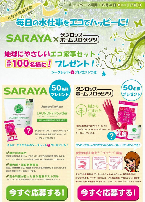 | タイトル | 毎日の水仕事をエコでハッピーに! サラヤ×ダンロップホームプロダクツ コラボキャンペーン |