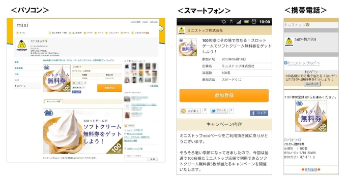 この機能を利用したキャンペーンの第一弾として、ミニストップ株式会社の運営するミニストップ公式mixiページ(http://p.mixi.jp/ministop)において、スピードくじキャンペーンが実施されています。