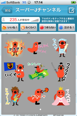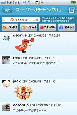 すべての「ピーチクスタンプ」は、アプリのタイムライン画面上にある「いいね!」「わくわく!」「つまらない」「泣ける!」の4種のボタンを押して好みのスタンプを選択することで投稿が可能です。