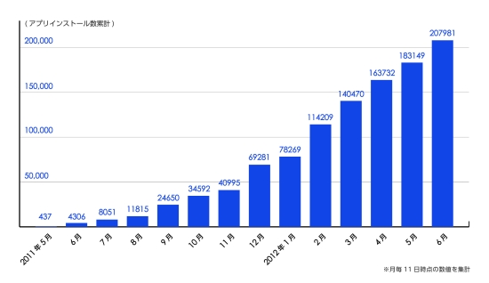 「モニプラ」アプリはサービス開始から約9ヶ月後の2012年2月に累計ユーザー数が10万人に達していますが、その半分以下の期間となる約4カ月後に累計20万人を突破したことによって、急速にユーザー数が増加していることが分かります。