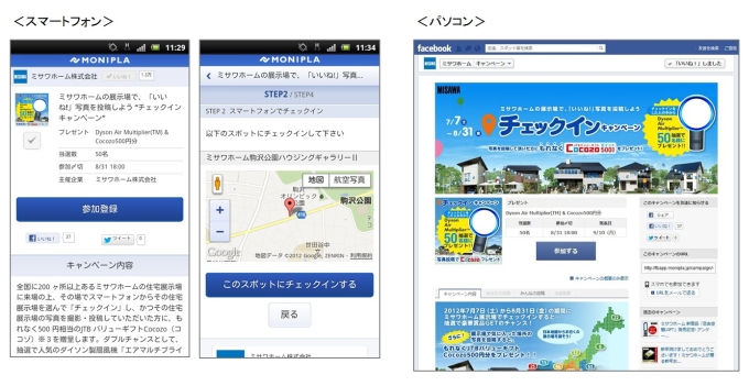 この機能を利用して、7月7日より、ミサワホームのFacebookページで「チェックイン キャンペーン」が実施されています。キャンペーン期間中に全国200カ所以上あるミサワホームの住宅展示場のいずれかに来場のうえ、その場からスマートフォンでキャンペーン画面にアクセスして今いる住宅展示場を選んでチェックインし、かつ住宅展示場の写真を撮影・投稿していただいた方に、もれなく500円相当の電子ギフトがプレゼントされます。また、ダブルチャンスとして、キャンペーンに参加いただいた方の中から抽選で計50名様に人気の家電製品が当たります。