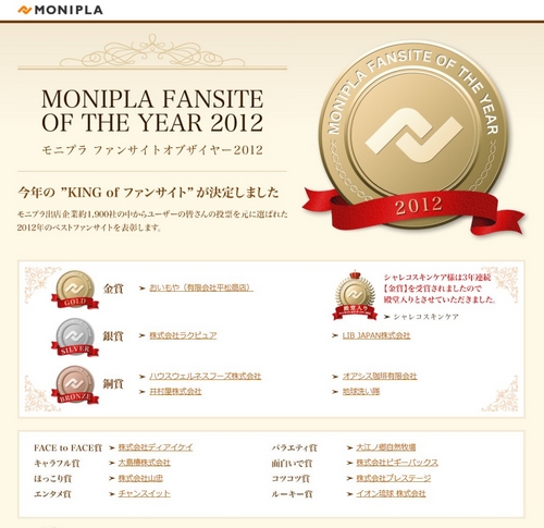 2009年の初回開催から今年で4度目を数える「ファンサイト・オブ・ザ・イヤー2012」は、2012年にモニプラに出展された企業ファンサイトの中から、ユーザー投票を元に「ファンに最も支持されたファンサイト」として金賞・銀賞・銅賞を選出しています。