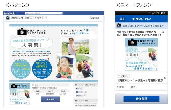 本キャンペーンでは、Facebookユーザーより、東日本大震災の被災地である東北の方々に向けた「笑顔写真」と「応援メッセージ」を募集いたします。投稿していただいた写真の中から、選考により30名様の写真とメッセージが、2013年3月8日~12日に宮城県仙台市で笑顔プロジェクトが開催する「笑顔の力~from東北~写真展Vol.5」において展示されます。また、投稿いただいた写真は、笑顔プロジェクトのFacebookページで順次公開される予定です。