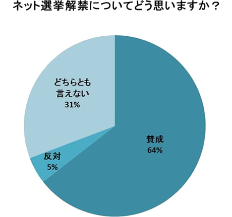また、ネット選挙の解禁をどう思うかについては64%が「賛成」、5%が「反対」とする一方で、「どちらとも言えない」という回答も31%にのぼっています。
