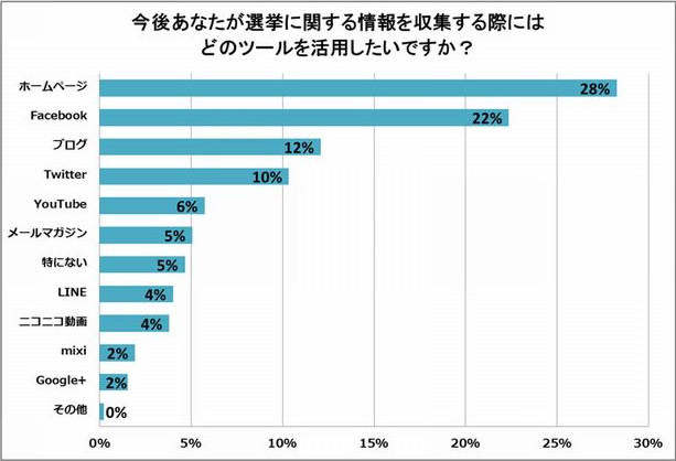 今後、選挙に関する情報を入手する際に活用したいインターネットツールでは「ホームページ」(28%)が最多、次いで「Facebook」(22%)、「ブログ」(12%)、「Twitter」(10%)という結果となりました。