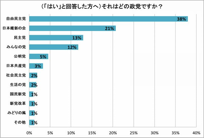 38%が「今後、Facebookで選挙活動の情報を受け取りたい政党がある」と回答。具体的な政党名については38%が「自由民主党」と回答し、次いで「日本維新の会」(21%)、「民主党」(13%)、「みんなの党」(12%)が挙げられています。