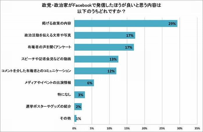 「政党・政治家がFacebookを活用することで、政策について知る機会が増えると思うか」という質問では、86%が「思う」と回答しています。また、「政党・政治家がFacebookで発信したほうが良いと思う内容」は、「掲げる政策の内容」(29%)、「政治活動を伝える文章や写真」(17%)など基本的な"ウォール投稿"に加え、「有権者の声を聞くアンケート」(17%)、「コメントを介した有権者とのコミュニケーション」(11%)など、Facebookならではの有権者との交流を期待する声も見られました。