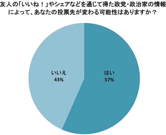 57%が「友人の『いいね!』や『シェア』を通じて得た政党・政治家の情報で、自分の投票先が変わる可能性がある」としており、Facebook上における友人の投稿が自分の「投票先選び」に影響すると考えていることが分かります。