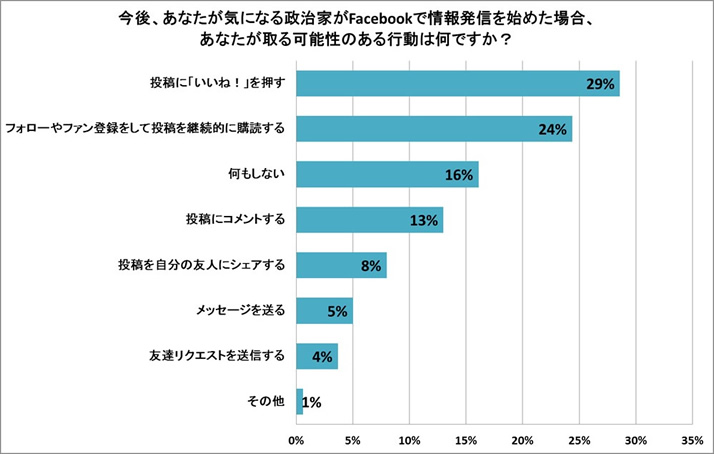 また、今後、ユーザー自身の気になる政党や政治家がFacebookで情報発信を始めた際に取る可能性のある行動については「投稿に『いいね!』を押す」(29%)、「『フォロー』やファン登録で投稿を継続的に購読する」(24%)が「何もしない」(16%)を上回り、気になる政党・政治家の発信する情報についてはFacebook上で積極的に共有する意向があることを示唆しています。