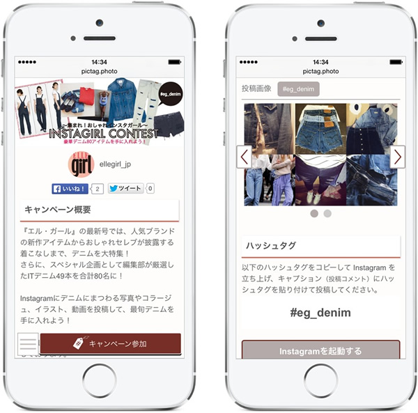 今回の機能拡充に先立ち、株式会社ハースト婦人画報社が発行するインターナショナルモード誌「エル・ガール」(http://ellegirl.jp/)5月号(3月23日発売)と連動したフォトコンテスト「INSTAGIRL CONTEST 集まれ!おしゃれインスタガール 豪華デニム80アイテムを手に入れよう!」にpictagが導入されています。