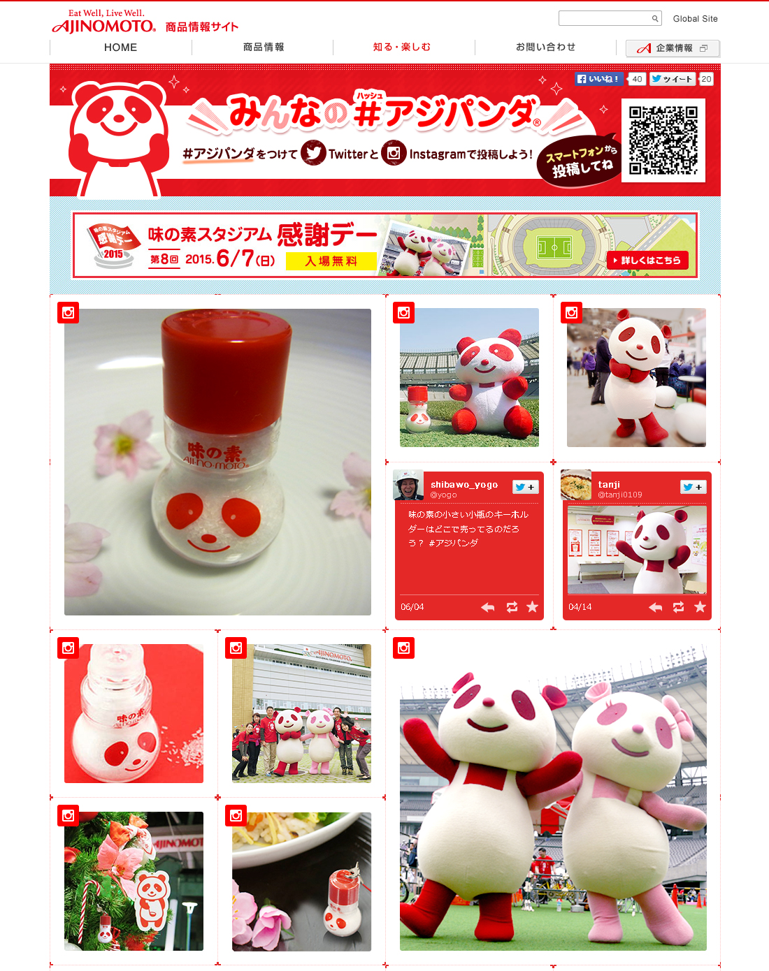 本サイトは6月7日(日)に味の素スタジアム(東京都調布市)で開催されるイベント「味の素スタジアム感謝デー2015」と連携しており、会場内に設置されている様々な「アジパンダ®」や、場内を回遊する「アジパンダ®」と一緒に写真を撮影し、ハッシュタグとともに「#アジパンダ」と記しTwitterまたはInstagramで投稿すると、「みんなの#アジパンダ®」サイトに写真が集約されて表示される仕組みです。