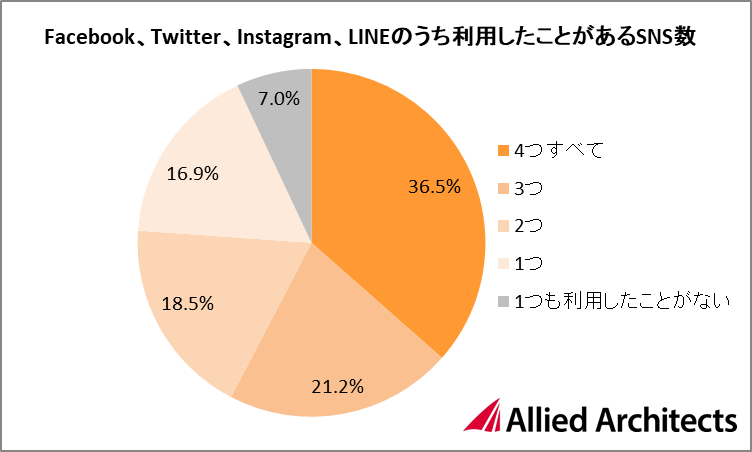 なかでも代表的なSNSとして知られている、Facebook、Twitter、Instagram、LINE(以下「4大SNS」という)に絞ってみると、4つすべて使ったことがある人は36.5%、1つでも使ったことがある人は93.0%、1つも利用したことのない人は7.0%でした。