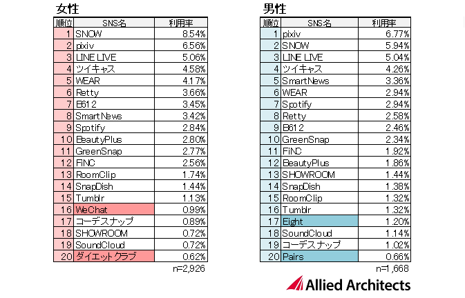 ライブ配信や画像加工など新興SNSの利用率ランキング、性別や世代別データも公開。
