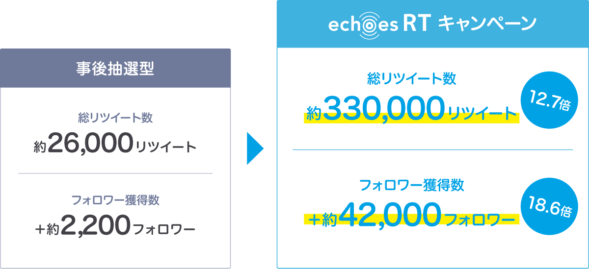 その結果、新規フォロワー増加数は約42,000フォロワーとなりキャンペーン開始前の1.8倍以上に急増、事後抽選型のTwitterキャンペーンの数値と比較してもリツイート数が12倍、フォロワーの増加数も18倍となり新規顧客層へのリーチ拡大に成功しました。 また、echoes Couponを活用することで、来店者数の計測ができないという課題を解決し、来店誘導において想定数値よりも上回った成果をあげることができ、来店への貢献も可視化されました。