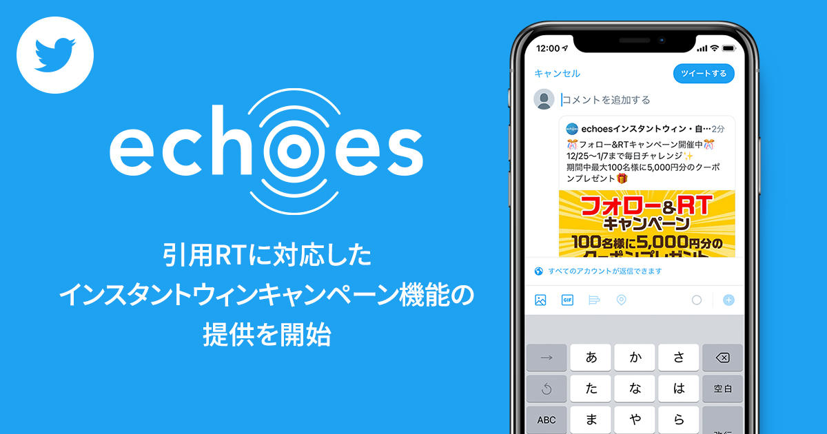 ソーシャルテクノロジーによる生活者マーケティングの実現を支援するアライドアーキテクツ株式会社(東京都渋谷区、代表取締役CEO 中村壮秀、証券コード:6081)は、当社の”生活者を味方にする” Twitterプロモーション統合管理ツール「echoes」が、Twitterの引用リツイート(RT)に対応したインスタントウィンキャンペーン機能の提供を開始しましたのでお知らせいたします。