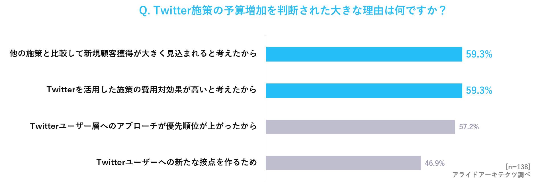 Twitter施策の予算が「非常に増加した」「やや増加した」と回答した方に対して、「Twitter施策の予算増加を判断した理由」について聞いたところ、59.3%の方が「新規顧客の獲得」と回答したことから、Twitter施策は新規獲得施策の1つとして位置づけられていることがわかります。同様に、59.3%の方が「費用対効果が高い」と回答したことから、Twitterは他の媒体に比べて効果が良いということがうかがえます。