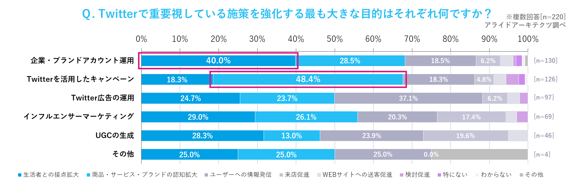また、施策実施の目的として、企業公式アカウントの運用を行っている方のうち、40%が「生活者との接点拡大」、Twitterを活用したキャンペーンを実施した約50%の方が「商品・サービス・ブランドの認知拡大」と回答していることから、Twitter施策は、新規獲得施策の中でも、新規獲得領域におけるマーケティングファネル上位の「接点拡大」や「認知拡大」を目的に実施されていることが明らかとなりました。