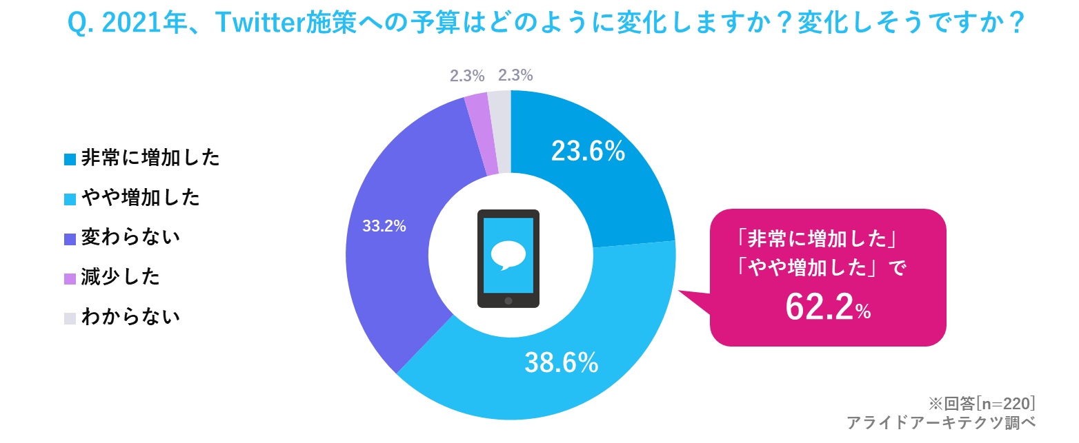 「2021年のTwitter施策の予算変化」について聞いたところ、62.2%の方がTwitter施策の予算が「増加した」と回答したことから、2020年に続いて拡大傾向にあることがわかりました。