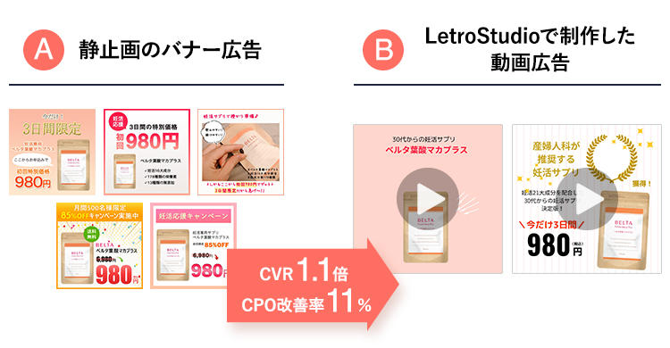 さらに、「静止画のバナー広告」と「LetroStudioで制作した動画広告」でA/Bテストを実施したところ、LetroStudioで制作した動画広告のほうが効果的であることが判明。バナーに比べてCVR1.1倍、CPO改善率11%となる高い成果を出すことができました。クリエイティブ制作で終わらず、広告成果を見ながらスピーディーにクリエイティブ改善を行ったことで即座に改良対応ができるようになり、新規顧客獲得の効率化を実現しています。