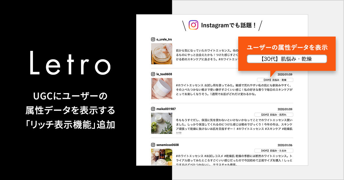 SaaSツールとデジタル人材で企業のマーケティングDXを支援するアライドアーキテクツ株式会社(東京都渋谷区、代表取締役社長 CEO:中村壮秀、証券コード:6081)は、このたびダイレクトマーケティング特化型UGC活用ソリューション「Letro」において、UGC施策のさらなる成果向上を実現するため、UGCにユーザーの属性データを表示する「リッチ表示機能」を追加しましたことをお知らせいたします。