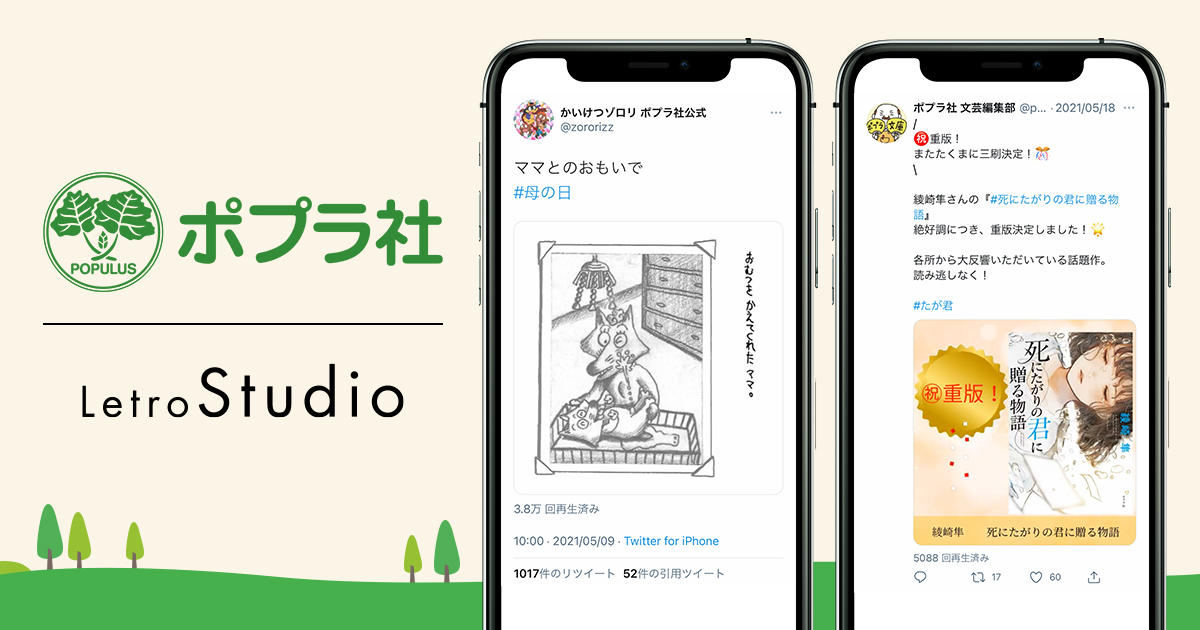 ポプラ社では、TwitterやInstagramなどSNSを活用した書籍情報の発信を強化しています。この度、公式SNSアカウントから発信される情報をより効率的にユーザーにリーチさせ、施策効果を最大化させるために、アカウントの投稿に「動画」を取り入れることを決定。自社で動画コンテンツを制作することで、動画制作に関する外注費用といった施策への投下コストを削減し、施策の投資対効果を向上させるために、LetroStudioを導入しました。