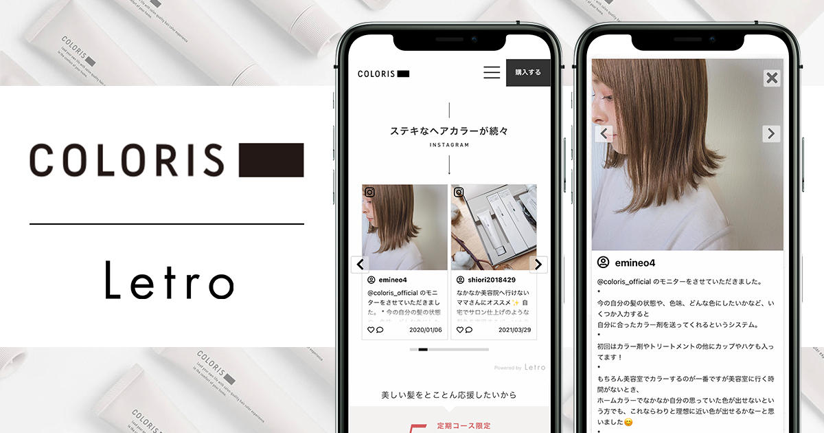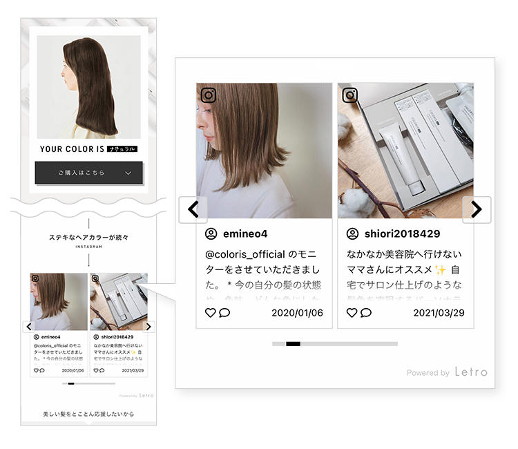 カラリスでは、サイト上に商品を体験したことのある人が発信するリアルなクチコミコンテンツ(UGC)を拡充することで、企業発信の商品情報に加えて顧客視点のリアルな情報を訴求し、検討層に向けて自然な形で商品購買の後押しとなることを目指して、Letroを用いたUGCの活用を開始しました。現在、新規顧客獲得向けLPと購入前に必須受診である「無料Webヘアカラー診断」のサイト内にUGCを掲載しています。