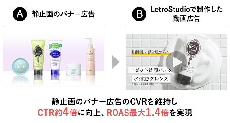 SaaSとデジタル人材で企業のマーケティングDXを支援するアライドアーキテクツ株式会社(東京都渋谷区、代表取締役社長 CEO:中村壮秀、証券コード:6081)は、このたび化粧品ブランドを展開するロゼット株式会社(東京都品川区、代表取締役社長:藤井 敬二、以下ロゼット)に対し、動画作成支援サービス「LetroStudio(レトロスタジオ)」の提供を開始しました。ロゼットではLetroStuidoを活用してAmazon動画広告のクリエイティブを制作したことで、従来の静止画バナー広告のCVRを維持しつつ、CTRを約4倍に引き上げ、ROAS最大1.4倍を実現しました。