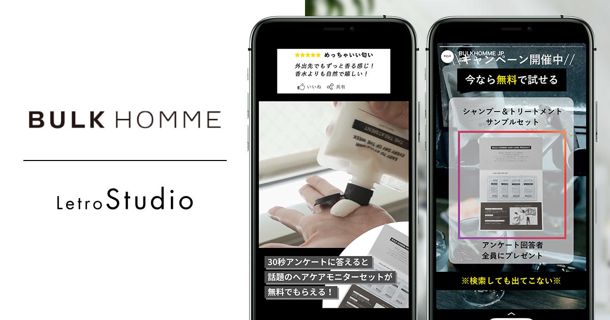 SaaSとデジタル人材で企業のマーケティングDXを支援するアライドアーキテクツ株式会社(東京都渋谷区、代表取締役社長 CEO:中村壮秀、証券コード:6081)は、このたびメンズスキンケアブランド「BULK HOMME」(運営:株式会社バルクオム、東京都港区、代表取締役CEO:野口 卓也、以下バルクオム)に対し、動画作成支援サービス「LetroStudio(レトロスタジオ)」の提供を開始しました。バルクオムではLetroStudioを使用して動画広告用のクリエイティブを制作したことで、動画制作時間を1/7まで短縮させながら月あたり10万円以上の制作費削減に成功しました。