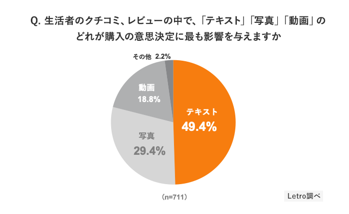 また、昨今「TikTok売れ」という言葉が注目されているように、写真や動画を用いたリッチなコンテンツが消費活動の中で重要視されていますが、今回の調査ではテキストが持つ影響力が高いことがわかりました。TikTok等では動画が「衝動買い」を呼び起こすコンテンツとして奏効する傾向にありますが、生活者が購買まで様々な検討を重ねていく中では、「最後の一押し」としてテキストコンテンツが重要視されていると言えるでしょう。こうした結果からも、生活者は購入の意思決定の際には濃度の高い情報を求めていると考えられる為、今後はUGCの質に注視した施策が注目されると考えます。