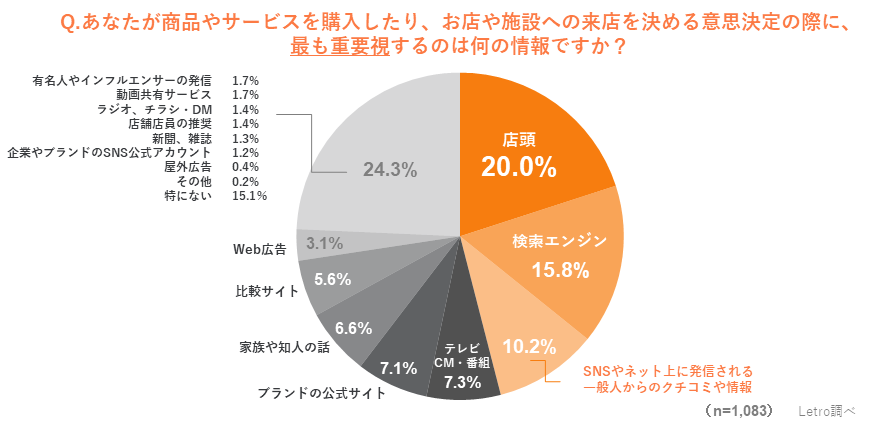 さらに、「購入や来店の意思決定の際に、最も重要視する情報」について聞いたところ、TOP3は「店頭(20.0%)」「検索エンジン(15.8%)」「SNSやネット上に発信される一般人からのクチコミや情報(10.2%)」の順となりました。「店頭」「検索エンジン」「SNSやネット上に発信される一般人からのクチコミや情報」の3つは、「知るきっかけ」から「情報検索」、「意思決定」の全てのフェーズにおいて多くの回答を集めており、生活者の購買行動において重要な情報源となっていることがわかります。