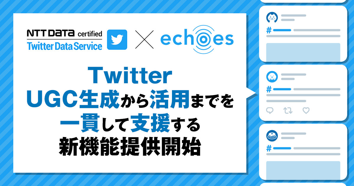 企業のマーケティングDXを支援するアライドアーキテクツ株式会社(東京都渋谷区、代表取締役社長 CEO:中村壮秀、証券コード:6081)でSaaS事業を展開するプロダクトカンパニー(カンパニープレジデント:村岡弥真人)が提供するSNSマーケティング支援SaaS「echoes(エコーズ)」はこの度、米Twitter社の最上位Twitter Official Data Partnerである株式会社NTTデータ(以下、NTTデータ)による「Twitterデータ提供サービス(インテグレーション)認定サービスプログラム」に認定されました。これを受け、TwitterのUGCを管理する新機能の提供を開始しますことをお知らせいたします。