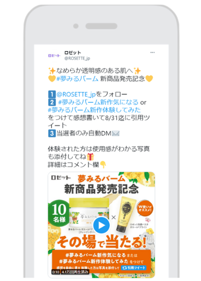 本発売時に話題化・認知拡大を最大化することを目的としたTwitter広告とキャンペーンを実施。ロゼット公式Twitterアカウントをフォローし、「#夢みるバーム新作体験してみた」 または「#夢みるバーム新作気になる」をつけて引用ツイートで参加できるTwitterインスタントウィンキャンペーンを設計し、未購入者には期待感を、体験者には使用感のツイート投稿を促進しました。