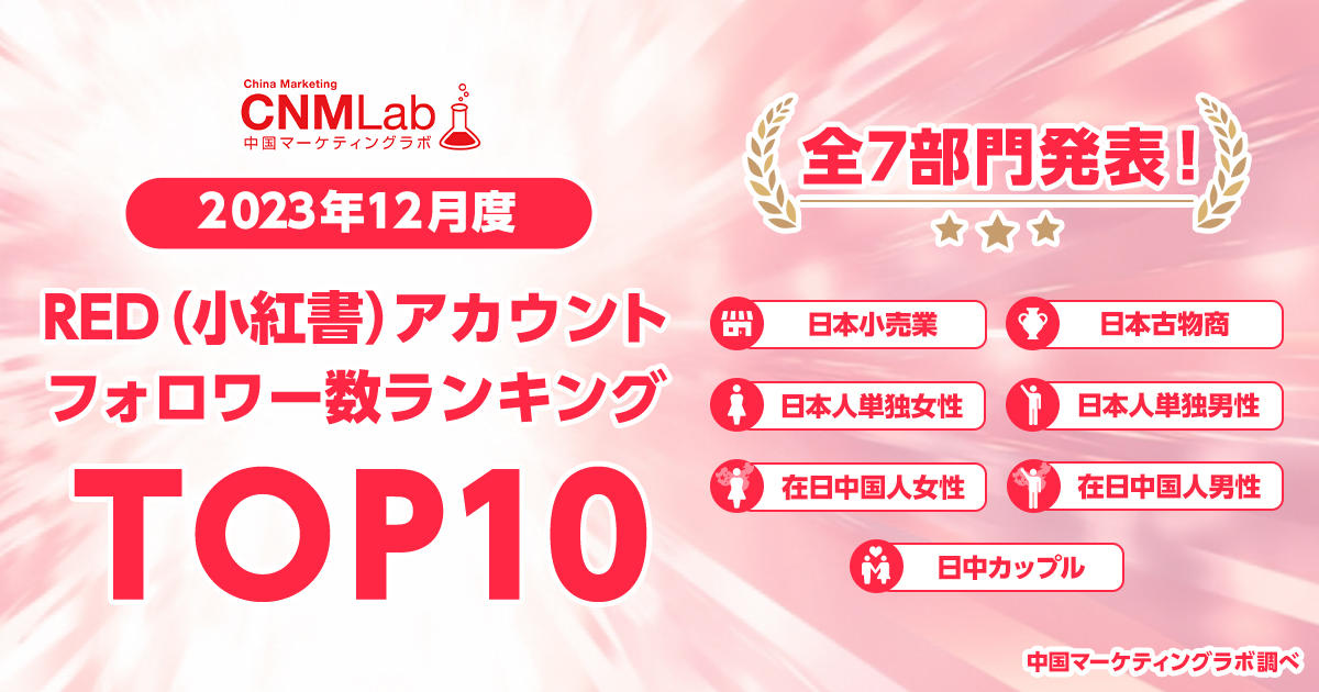 インバウンドの回復に伴い、RED(小紅書)活用がさらに活発に!中国マーケティングラボ(CNMLab)が全7部門のREDアカウントフォロワー数ランキングTOP10を発表