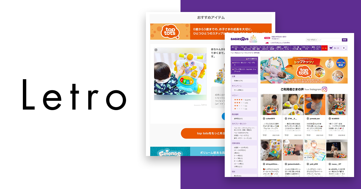 企業のマーケティングDXを支援するアライドアーキテクツ株式会社(東京都渋谷区、代表取締役社長 CEO:中村壮秀、証券コード:6081)でSaaS事業を展開するプロダクトカンパニー(カンパニープレジデント:村岡弥真人)は、日本トイザらス株式会社(以下、トイザらス)が運営するおもちゃとベビー用品のECサイト「トイザらス・ベビーザらス オンラインストア」に対し、当社の運用型UGC(※1)ソリューション「Letro(レトロ)」を通じて、ECサイトの各ページにおけるユーザー体験向上のためにUGCを活用した支援を行いました。