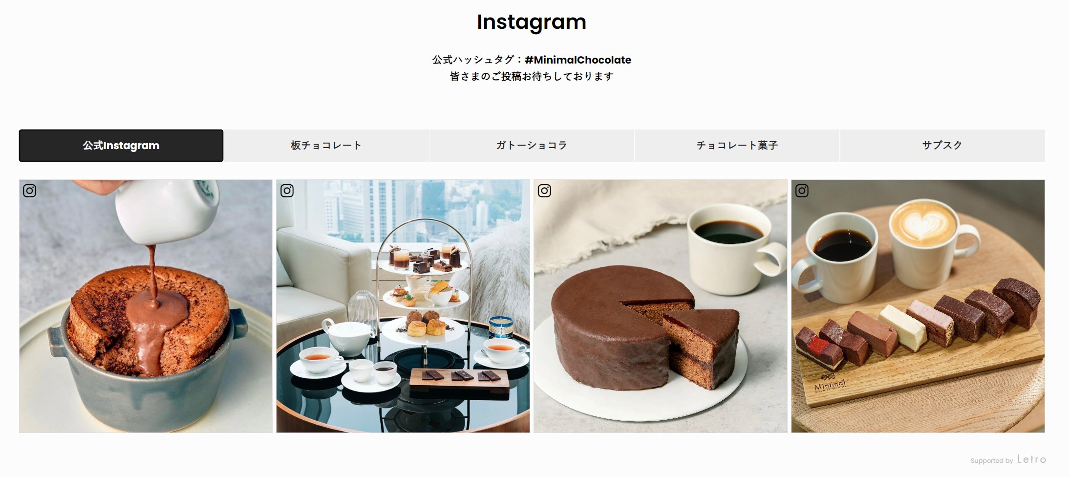 オンラインショップのTOPページやMinimalの新作や限定品が毎月届く定期便「CHOCOLATE ADDICT CLUB」の申し込みページ、商品個別ページにLetroを活用してInstagram投稿の掲載を開始しました。 TOPページには、「タブ表示機能(※1)」を活用し、5つのタブに分けてMinimalの世界観にマッチしたInstagram投稿を掲載。ECサイトにUGCを掲載した際、表示部分のクリック率はLetro利用企業の平均が3%程度である一方、Minimalでは平均30.3%を記録しました。さらにタブ表示機能を活用した表示形式とLetroを表示しない形式でA/Bテストを実施したところ、タブ表示機能を活用した表示形式の方がCVR1.34倍と好調な結果となりました。