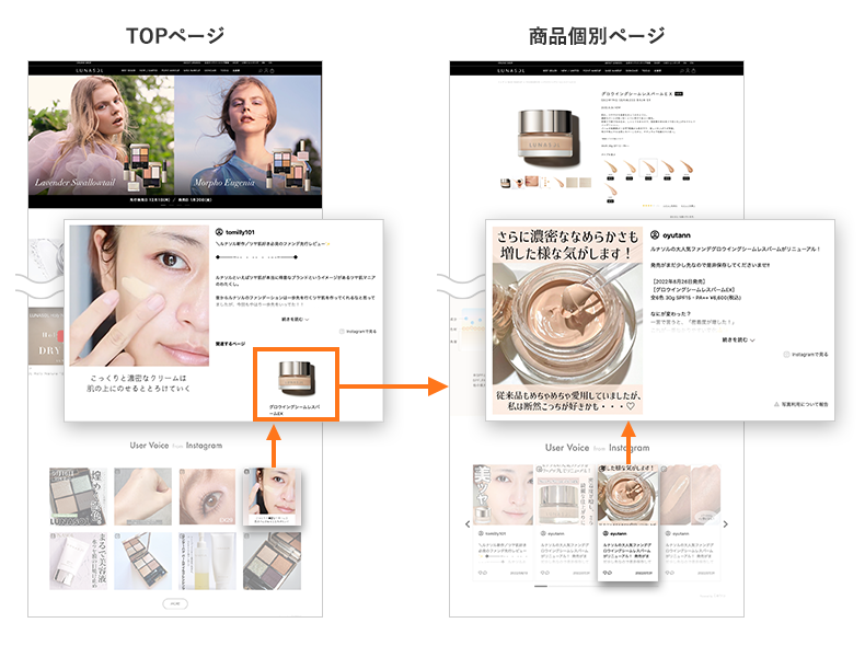 ルナソルでは、Letroを活用してECサイトのトップページと商品個別ページにUGCの掲載を開始しました。UGC運用の手始めに、各サイトの訪問者の想定状態を踏まえてUGCで補足すべき情報を定義し、それらを表現するUGCをInstagram上から収集して掲載しました。入口となるTOPページには、商品の色味や質感、仕上がりなど、実際に商品を手に取った際にわかる情報を視覚的に訴求することで、商品に興味をもってもらい商品サイトへ遷移させることを狙いました。一方商品個別ページでは、実際の使用感や肌の変化などを「利⽤きっかけへの共感性」や「同じ悩み・目指す姿を持つ人」のユーザーインサイトを含んだテキストで訴求することで、購買のきっかけにつなげていきます。