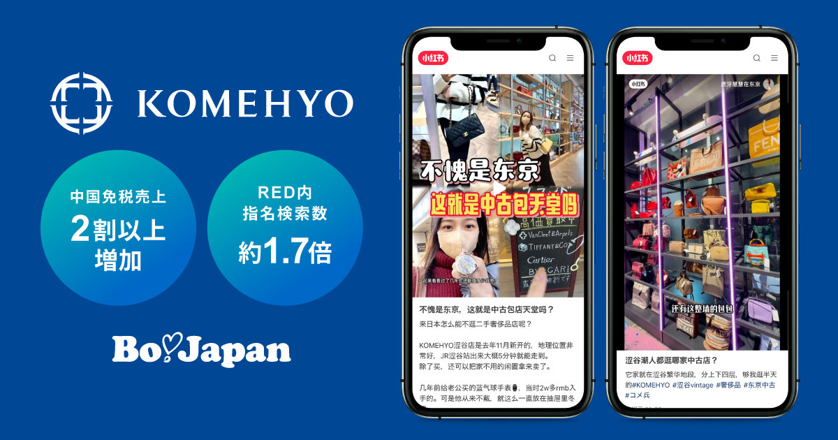 コメ兵がRED(小紅書)施策として、BoJapanを活用したKOC内覧会と広告出稿を実施!広告出稿中の複数月において、中国免税売上が施策実施前の2割以上増加